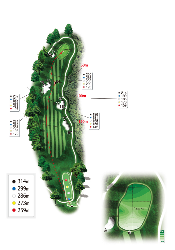 - 약간 우도그랙으로 그린까지 가파른 오르막 지형에 숲속의 깊은 계곡 울창한 산림 속에 자리를 한 스케일이 웅장한 파4홀이다.