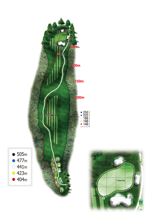 - 거리도 짧고 페어웨이 중간부터 그린까지 가파른 낭떠러지 경사로 조성된 파5홀로 정교하게 아이언으로 페어웨이 중앙을 보고 티샷하는 것이 바람직하다.