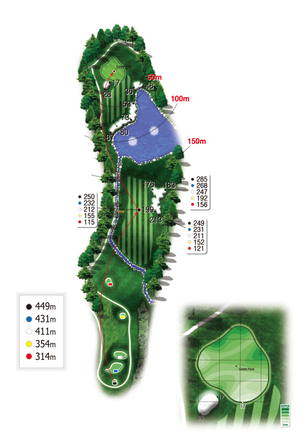 - 멀리 커다란 해저드 양쪽으로 뿜어내는 분수를 보면 정취가 돋보이는 파4홀로 가파른 내리막 지형에 거리도 매우 길다. 티샷은 해저드 분수와 분수 사이를 겨냥하면 중앙에 안착된다.