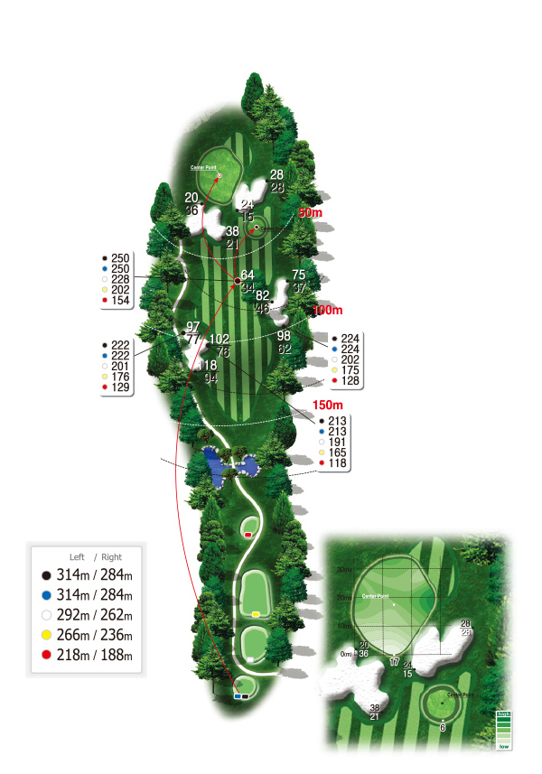 그러나 양쪽으로 대형벙커들이 그린 입구를 거의 닫아 놓은 듯하여 시각적으로 위압감을 들게 하나 다소 길게 공략하면 온그린이 무난하다. 넓게 펼쳐진 그린 형태로 온 그린에 실패시 거리 목 표시를 믿고 정확하게 어프로치를 해야 한다.