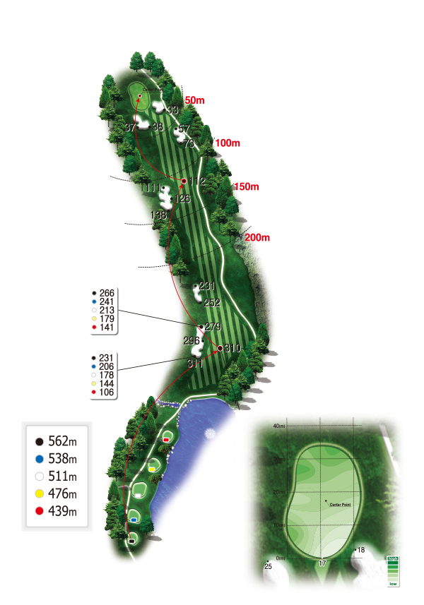 - 좌로 꺽어진 긴 거리 파5홀로 티샷의 방향에 따라 남은 거리 차이가 많이 난다. 장타자는 두번째 벙커를 넘기고 싶은 유혹이 있으나 전방에 보이는 법면 작은 소나무를 향한 티샷이 가장 안전하다.