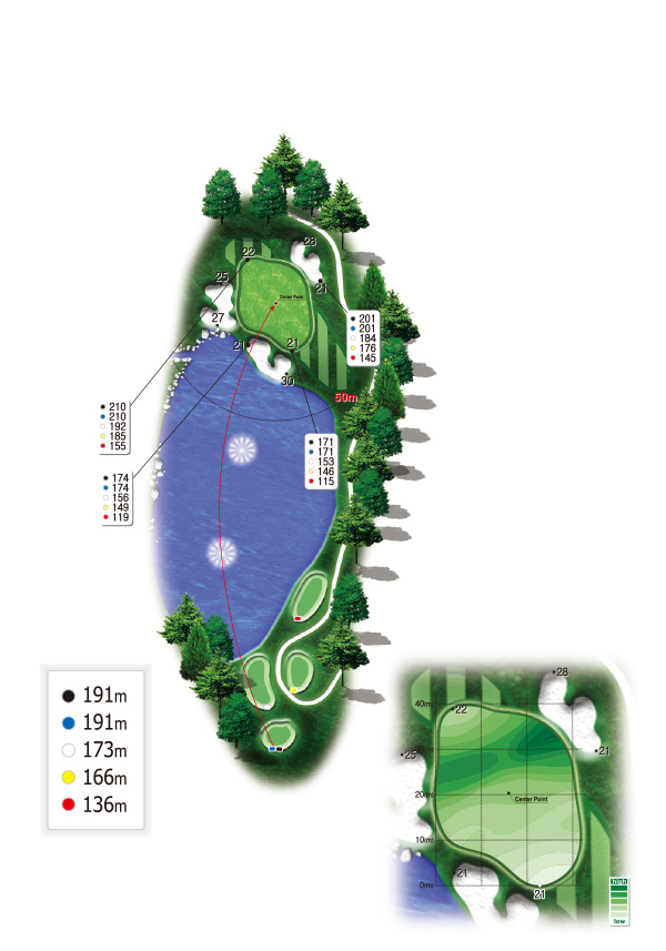 - 거리가 상당히 길고 커다란 해저드를 직접 넘겨야 하는 압박감이 많은 파3홀로 이단 그린에 그린 주변은 모두 벙커로 둘러싸여 있다. 특히 그린 앞에는 대형벙커 두개가 포진하여 굴러 들어갈만한 입구가 없다.
